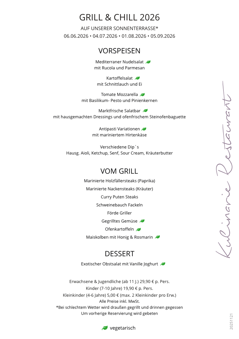 *Bei schlechtem Wetter wird draußen gegrillt und drinnen in unseren Restaurant gegessen