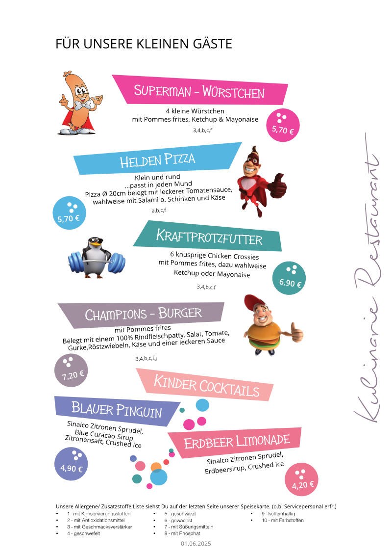 In unserer Speisekarte finden Sie für jeden Geschmack etwas. Wir legen großen Wert auf hohe Qualität und Frische, und das schmeckt man einfach. Natürlich haben wir dabei auch an den kleinen Snack zwischendurch an der Bahn sowie an unsere kleinen Besucher gedacht.