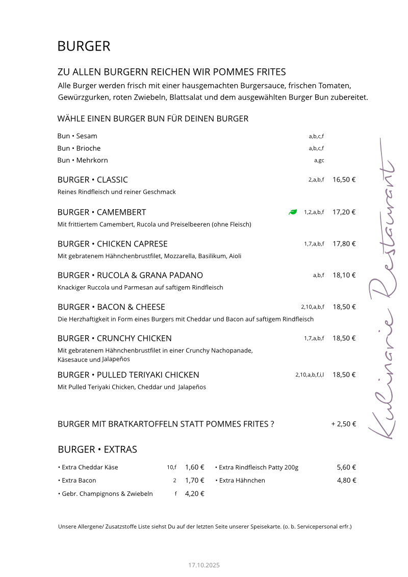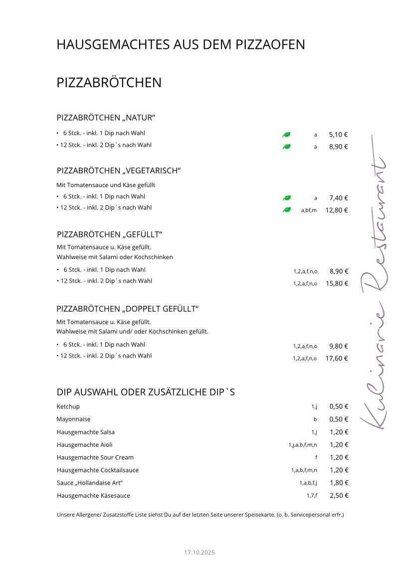 Wir sind bemüht auf unserer Webseite alle Angebote so aktuell wie möglich zu halten, aber nicht immer finden wir die Zeit z.B. unsere Speisekarte sofort bei Änderungen zu aktualisieren. Wenn es zu Abweichungen kommen sollte, so wird sie unser Serviceteam darüber informieren. Wir übernehmen keine Gewähr für die Aktualität. Vielen Dank für Ihr Verständnis.